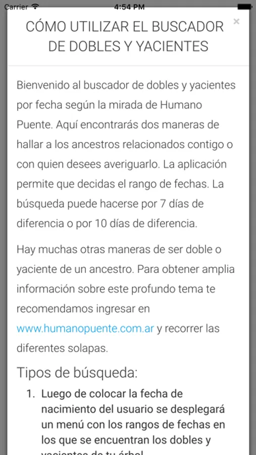 Quienes ya provienen de un camino realizado en este sentido se encontrarán con que, en el caso de los yacentes o yacientes, Humano Puente contempla un lugar más en los puntos de relación con los ancestros y es el punto llamado Línea Maestra con respecto al nacimiento del ancestro fallecido antes de que el usuario de la aplicación sea concebido. Esta modificación es por los resultados en experiencias de consulta que motivaron su inclusión.