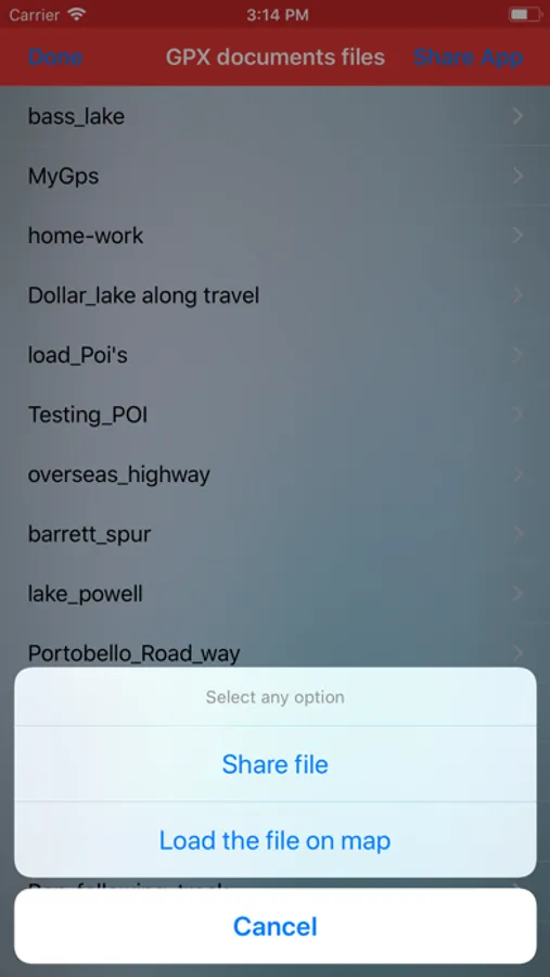 —>Tap on the file in Document folder to Share or export the gpx files to another application