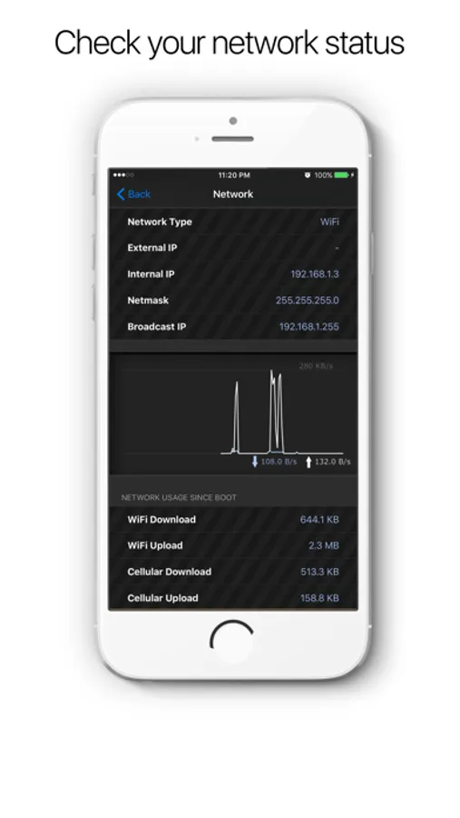 Monitor your network status in depth by checking internal/external IP's, netmasks, Broadcast IP's and more info displayed on real-time graphs!