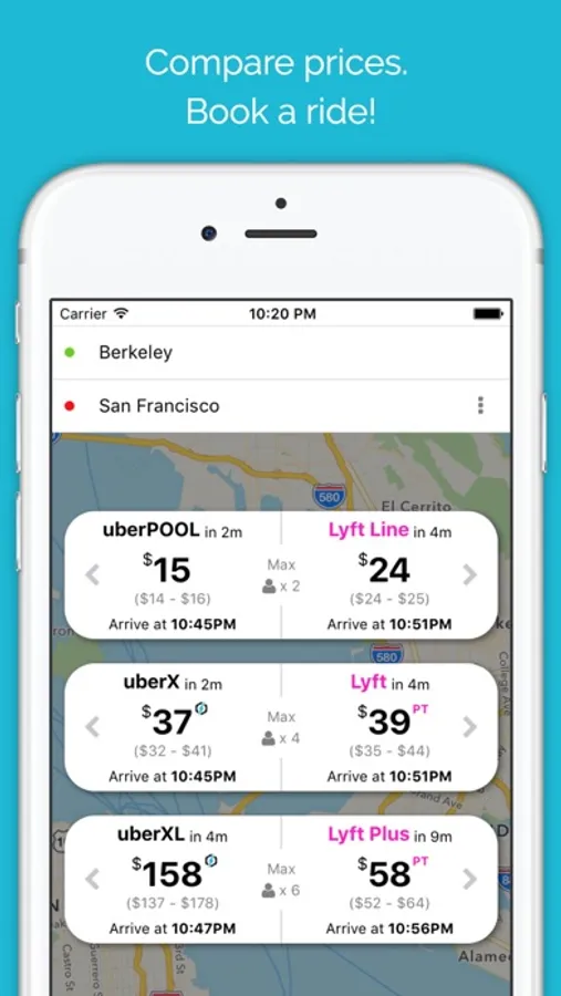 Compare fares between Uber and Lyft's product lines and get the ride you need at the lowest cost. FareWell averages costs and automatically factors Surge and Prime Time surcharges so you never have to!
