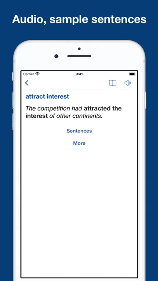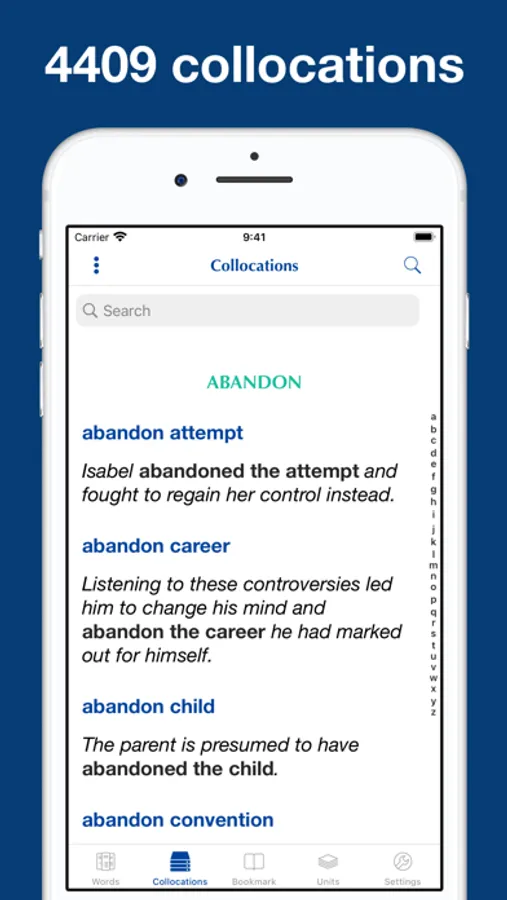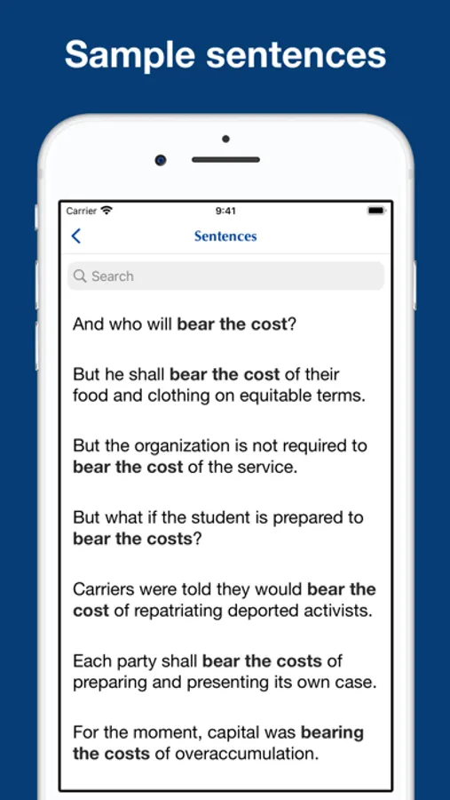 - Each collocation comes with a number of example sentences. Over 10000 sentences are added. This will help you to have better understanding of how a collocation is used in context.