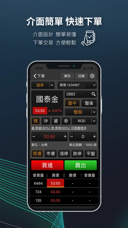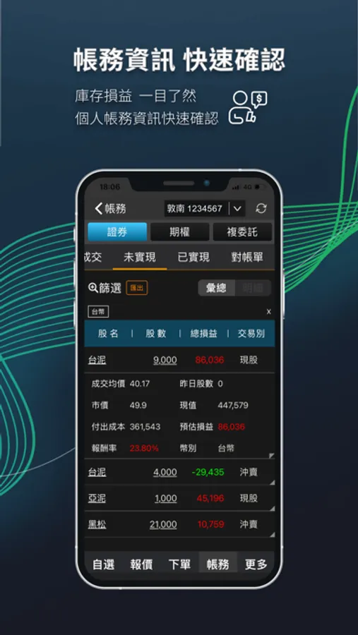 - 帳務操作最方便:委託回報、成交回報、即時庫存,一樣左右滑動,全盤掌握!