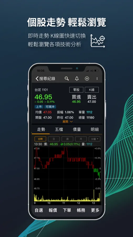 - 左右滑動,觀察多達20項的個股資訊:行情走勢、最佳五檔、行情報價、分價量表。股票分析,輕輕鬆鬆!