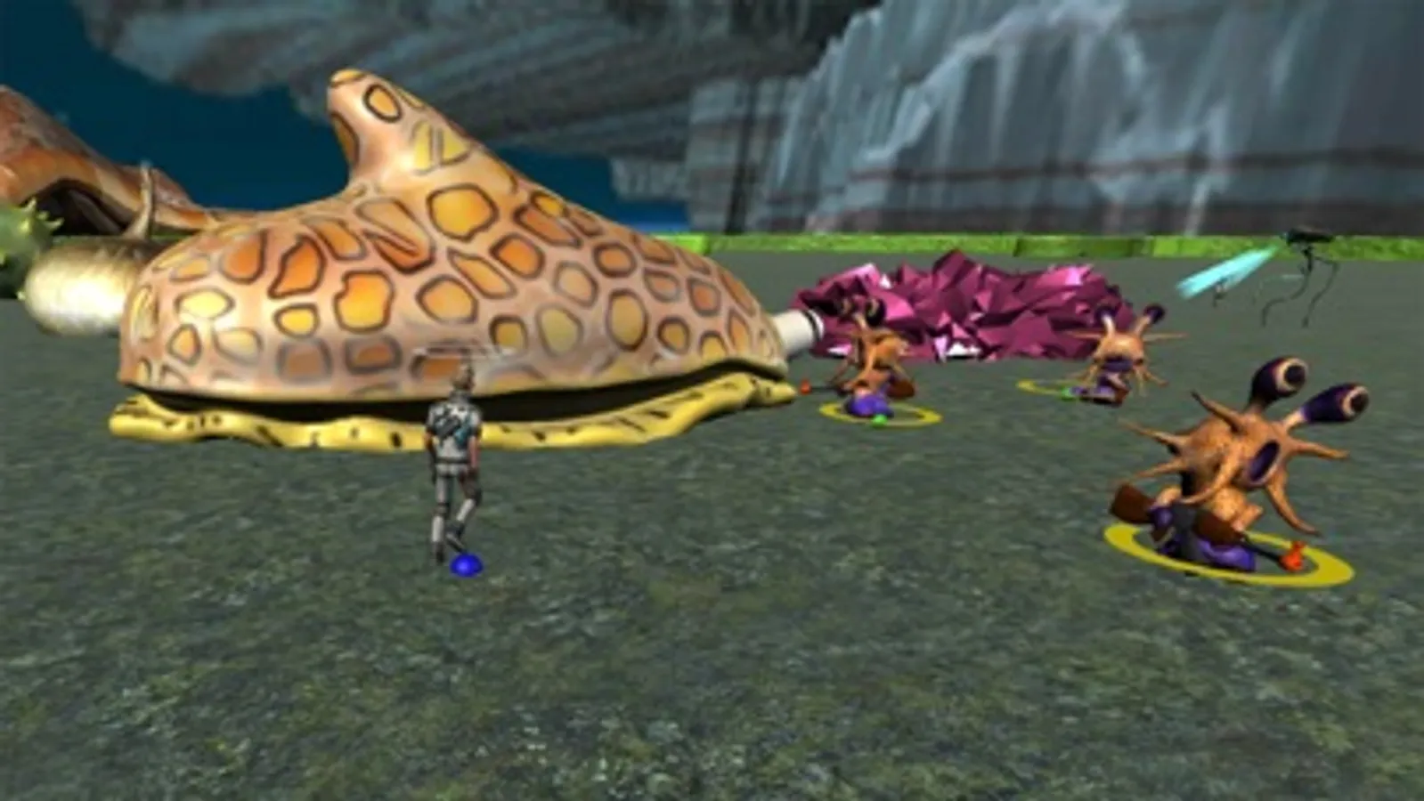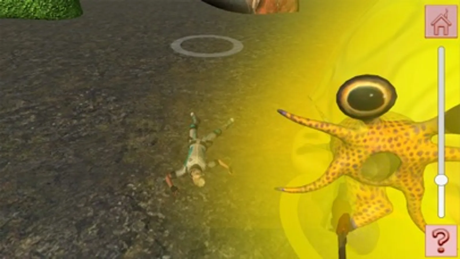 This is a kind of a stealth game.You are represented in this 3D world as an avatar finding yourself in the cross section of the gut with mouth somewhere above you (not visible). So the food transport occurs from top to bottom and you soon encounter e.g. a cucumber that lands on your level and small bears (=healthy food particles) start to march out of it to the gut wall having for their goal the factory which denotes the metabolism and biosynthesis. There they enable the creation of the elephants - macrophages - which jump towards you and circle around you in order to protect you. You have also another way of getting your protection. If you bump into the good food that has descended, bunnies come out of it. They stand for antibodies killing the evil antigens just like the macrophages also kill the antigens. However when you bump into bad food the antigens (small white combatants) emerge and start to shoot around. The antigens come also out of the harmful food or bacteria you swallowed - denoted here by the battle bus. There is also a capsule landing and out of it come the strange looking antibiotics with three legs. They also stand on your side, but beware of the toxins - robots - which after seeing you they run after you and shoot deadly shots at you.