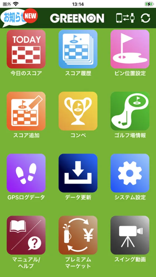 グリーンオン ザ・ゴルフウォッチで取得したプレイデータをブルートゥース(BLE)通信により、iPhoneやiPadに送ってプレイデータの閲覧や管理、iPhoneやiPadからピン位置データ転送、ゴルフウォッチのシステム設定変更、コースデータやファームウェアなどの更新ができます。