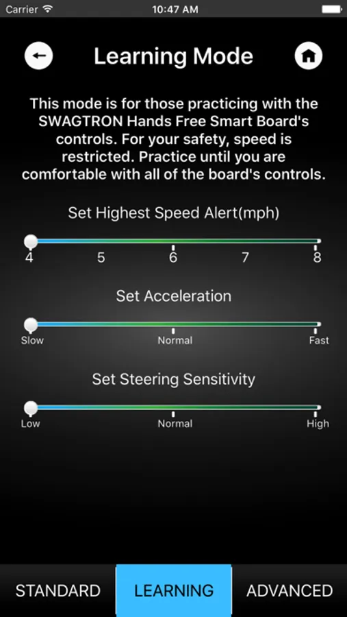 The SWAGTRON™ App is exclusively designed for use with the SWAGTRON™ T3 and the SWAGTRON™ T6. Through a Bluetooth® connection, the app can show information about the board's temperature, battery status, and much more. You can now simply use your mobile device and choose from three different riding mode selections to fit your experience level, including the one only available through the app.