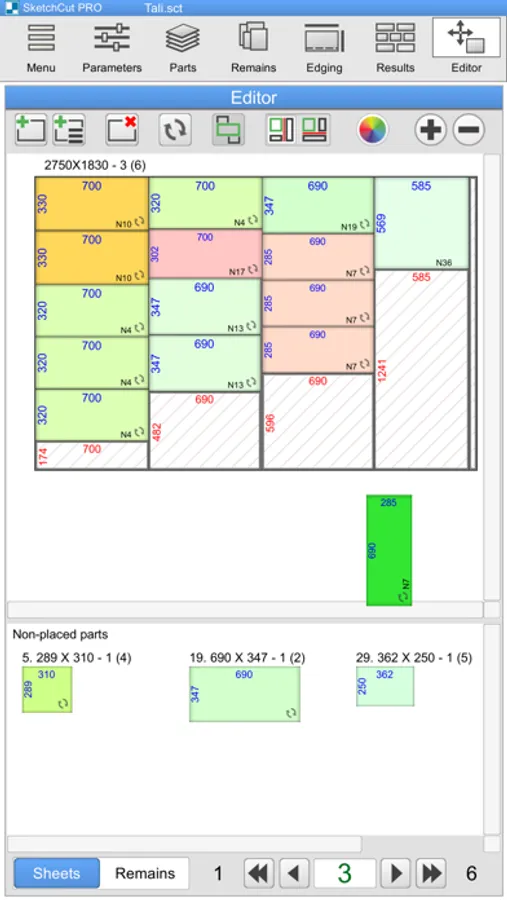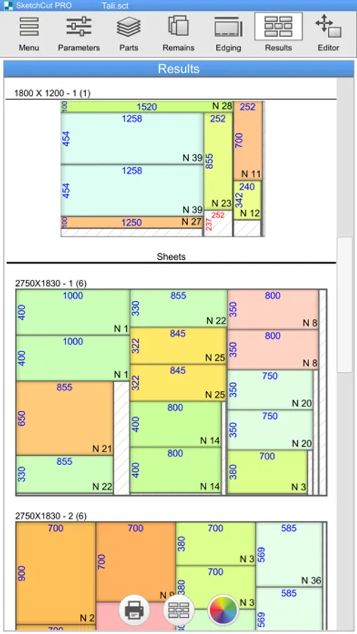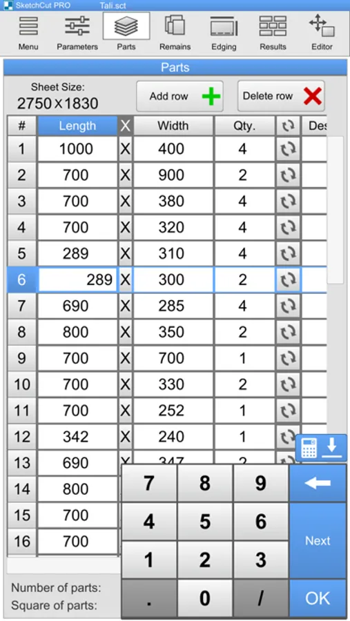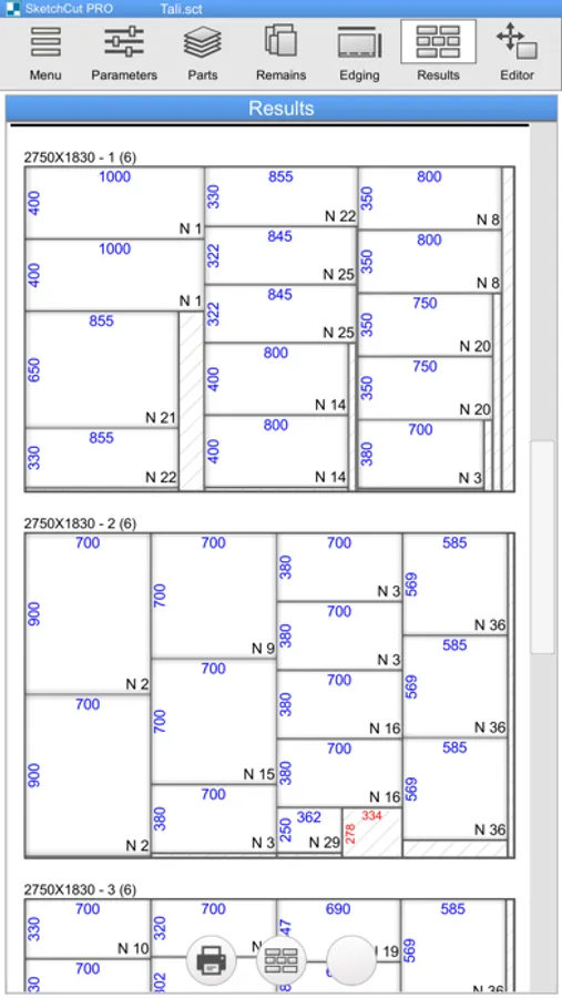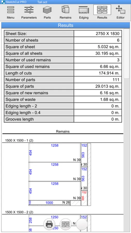 - automatic calculation of the area of parts and pieces, cut length, the length of the edges;