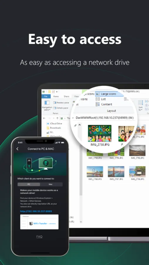 No USB cable needed anymore! Wirelessly transfer your media content between mobile devices, PC, MAC - no complex setup, no additional application needed.
