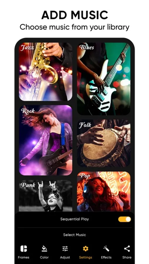 Create a photo and video sequence and play it by adding a background music.