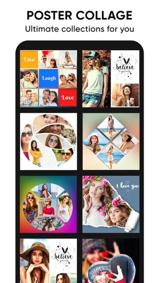The poster option allows you to create a stunning collage with a poster look by adding your favourite thought and applying some effects. Here you also have a variety of amazing poster options to choose from.