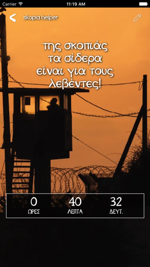 For the first time ever, the Bank of Cyprus has developed a loyal app buddy for soldiers, which will be by your side throughout your service. As soon as you download it and customize it with your details, stratapp will begin a countdown to your enlistment day, and once you are in the army, the app will start a countdown till you are discharged. You can add and subtract days based on any disciplinary enforcement days you have been given or have been dismissed of, and stratapp will update your results. Share your personal customized countdown results with your friends on Facebook, and get ready for the experience of a lifetime!
