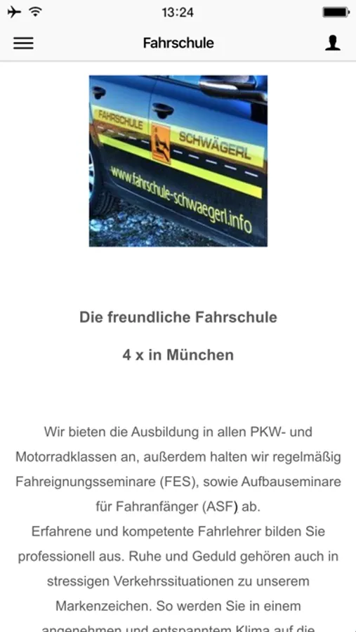 Die App der Fahrschule Schwägerl aus München. Hier finden sie alle Informationen zum Thema Führerschein, Aufbauseminare, Punkteabbau, Kontaktmöglichkeiten, sowie den aktuellen Theorieplan unserer Fahrschule. Ausserdem finden sie einen Lageplan aller unserer vier Filialen im Lehel, in Untergiesing, Obergiesing und Harlaching.