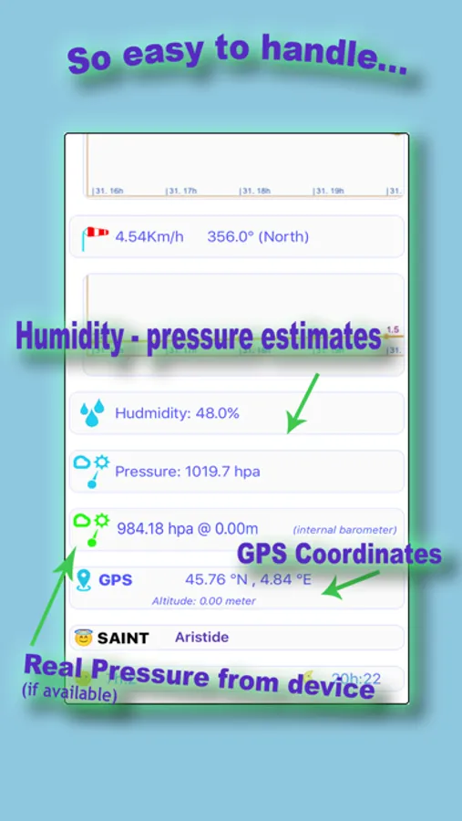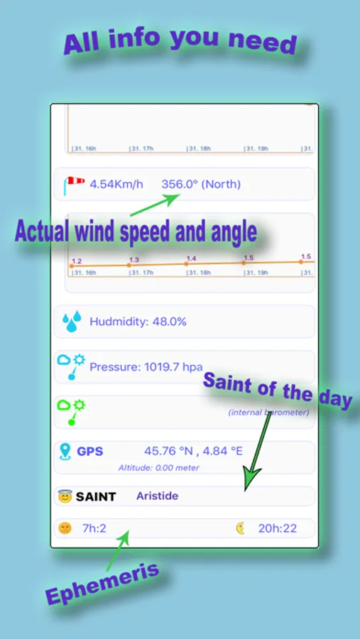 Everything is super simple , everything is readable directly . A graph of weather/Temperature and winds are displayed, as other various useful information.
