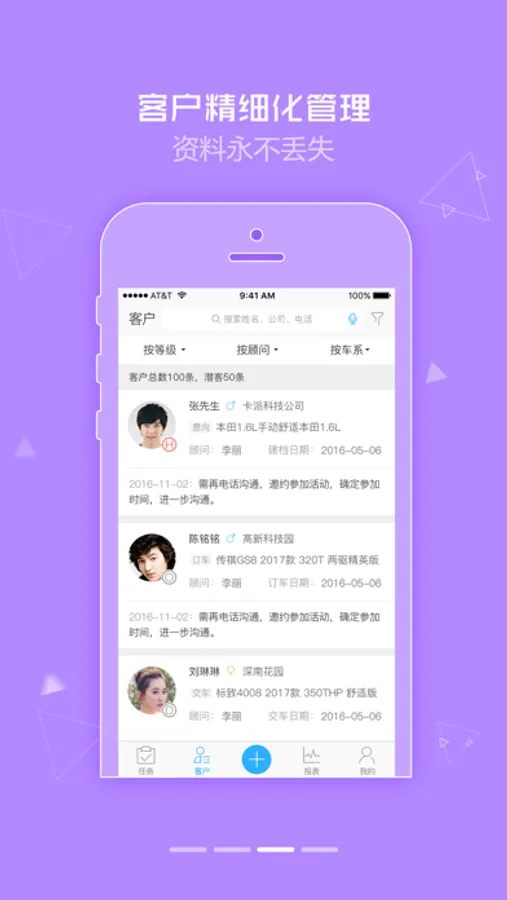 2、潜客管理:垂直流程开发,客户回访提醒,省时省力。