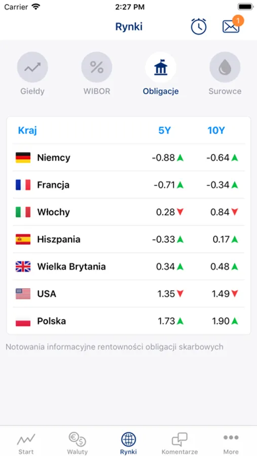 - notowania walut, indeksów giełdowych, surowców i rentowności obligacji
