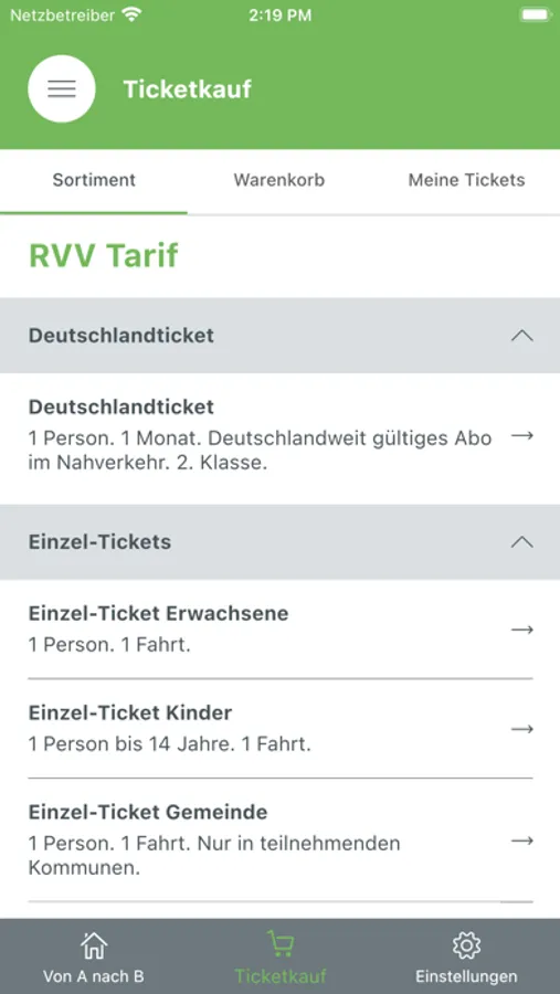 - Kauf aller im RVV für Gelegenheitsverkehr und für Park an Ride angebotenen Tickets