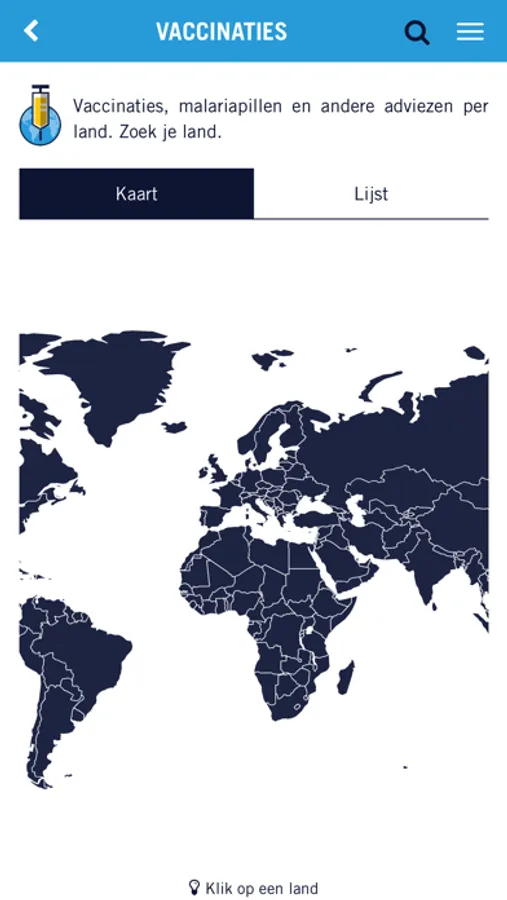 • In de landenzoeker kan men op de landkaart of in de landenlijst vinden welke vaccinaties nodig zijn per land.
