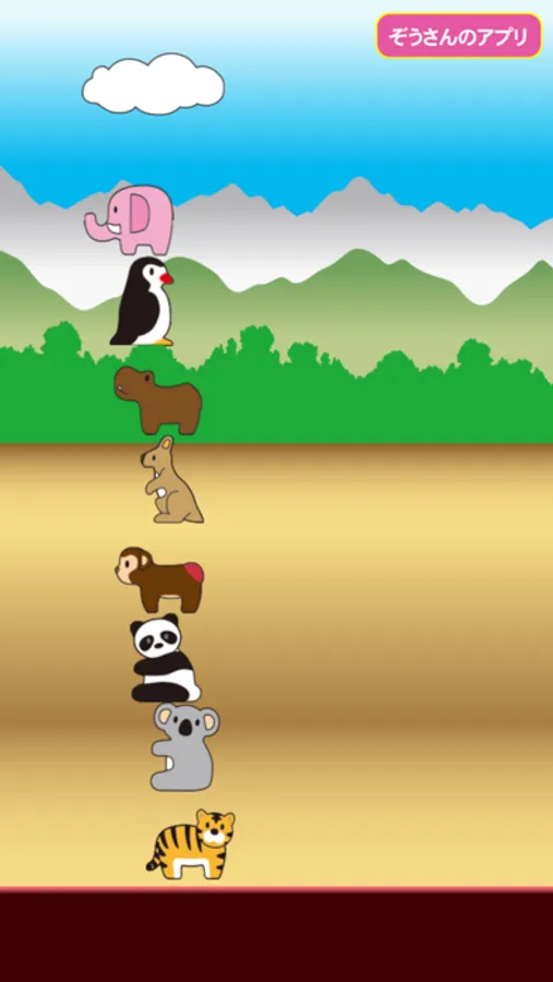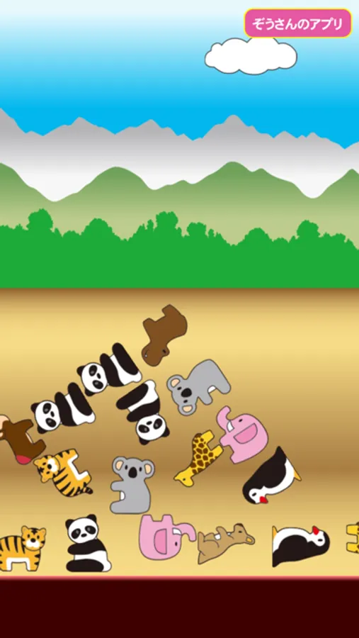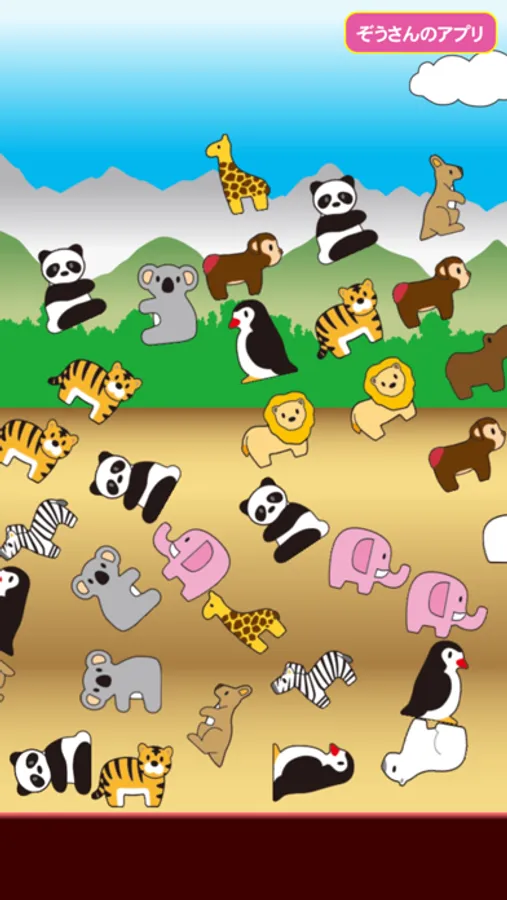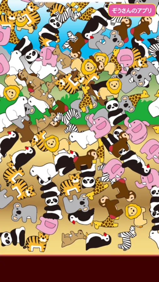 ライオン・ぞうさん・トラ・キリン・カバなどの色々な動物を積み上げたりちらかしたりして遊ぶことができます。