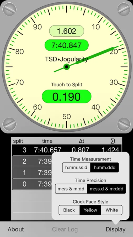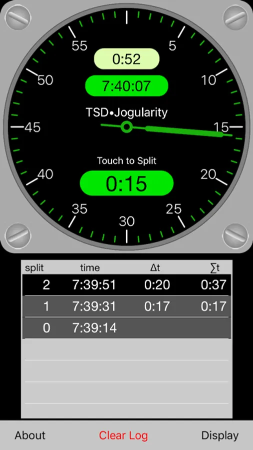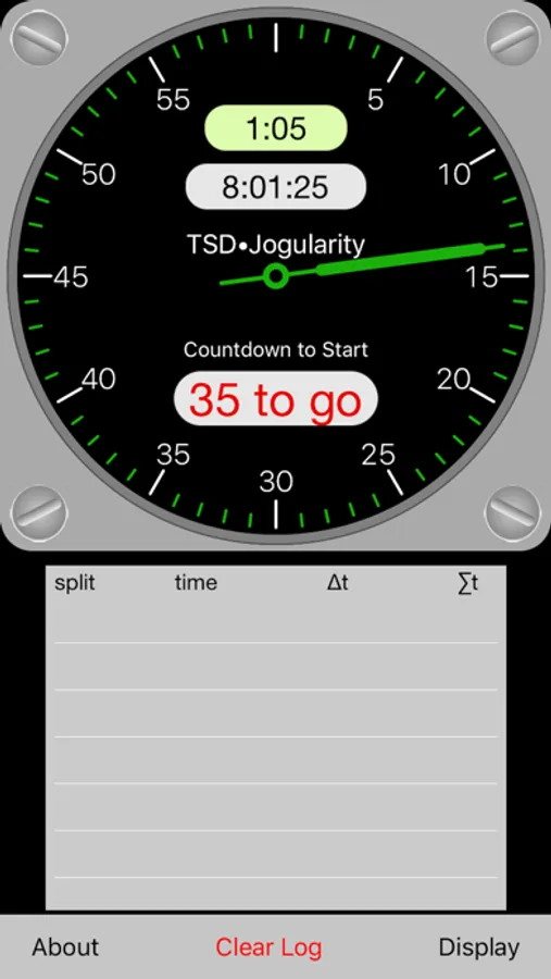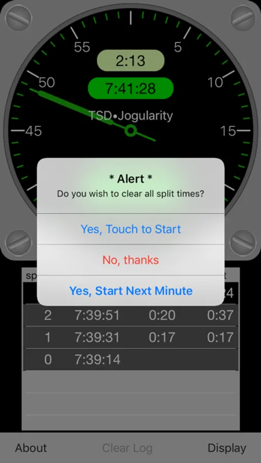 To clear the list of split times, touch the "Clear Log" button and answer the question "Yes." Start the rally by touching the clock face or by waiting until the next full minute.