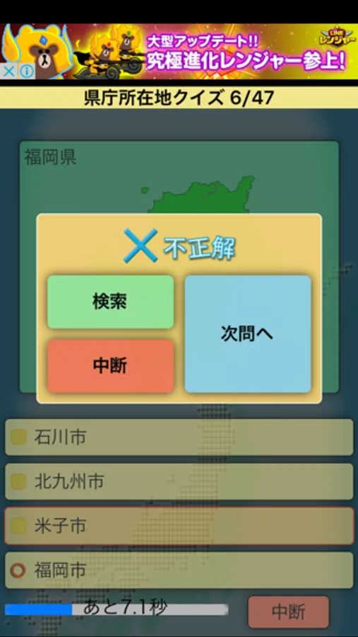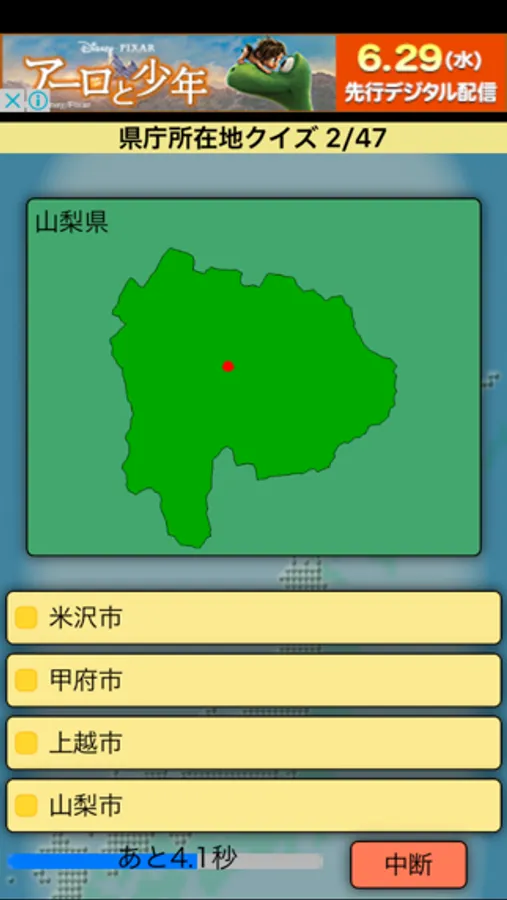都道府県の地図と名前を見て、県庁所在地の場所を4択から回答するクイズ。