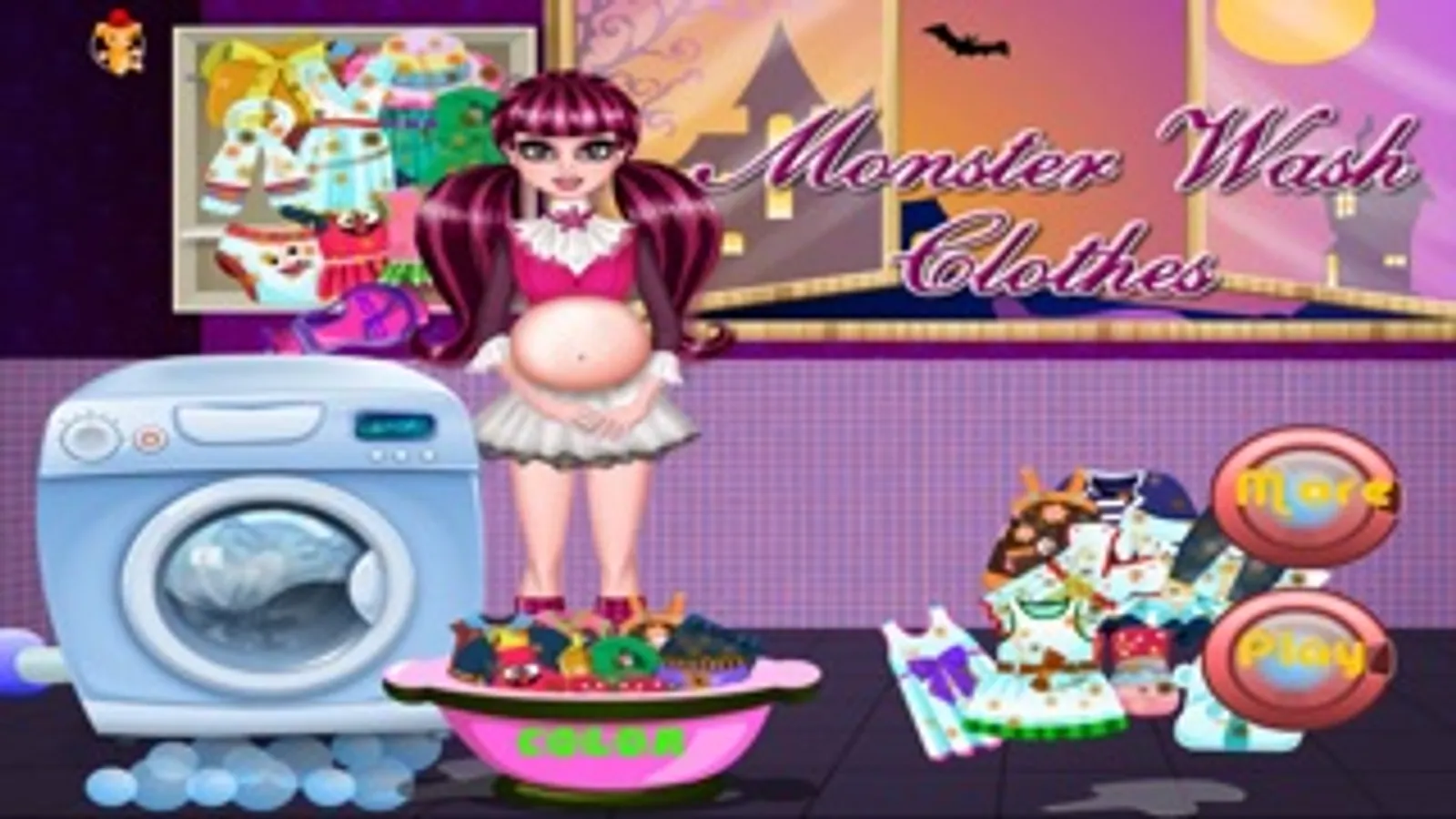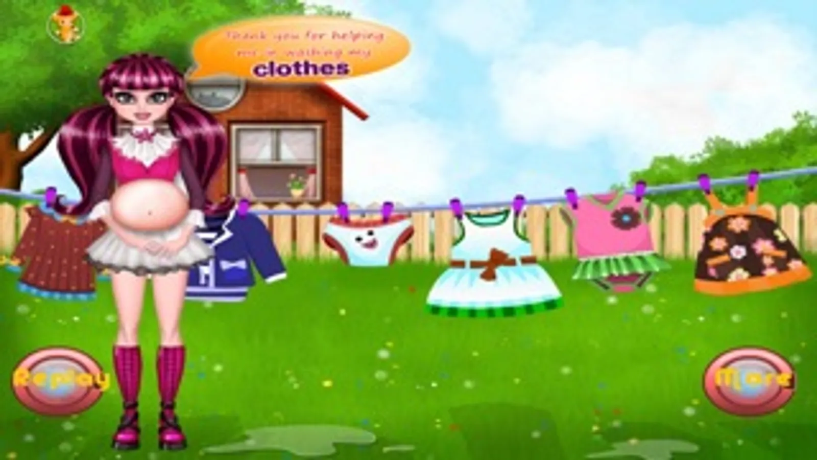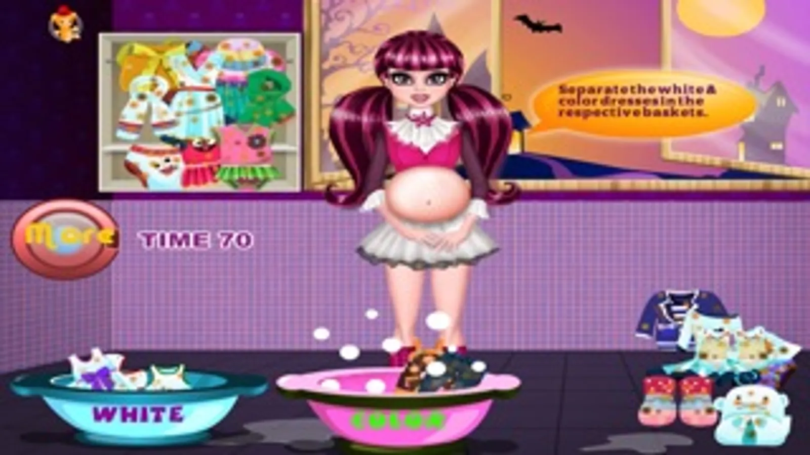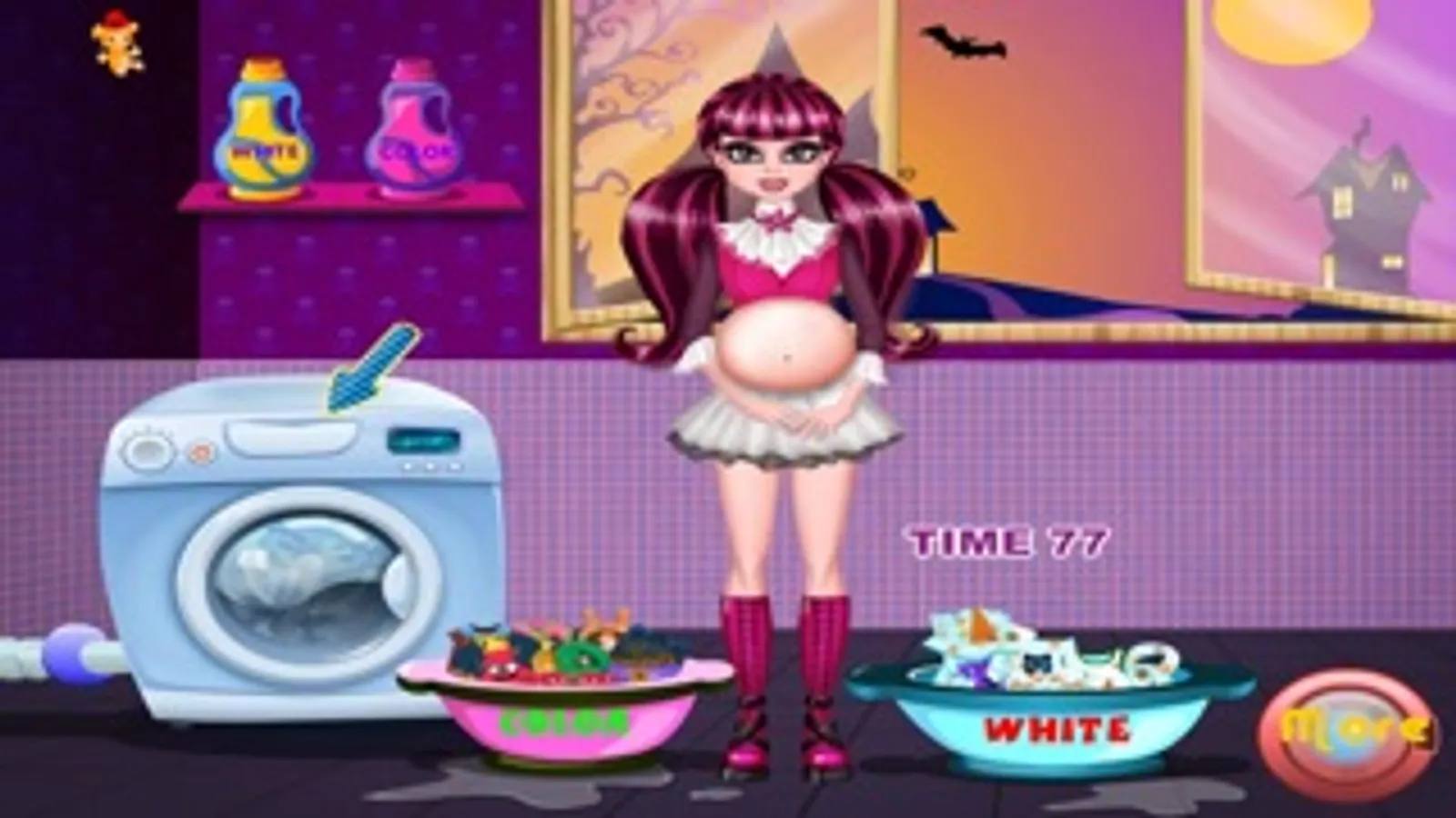 It is a long day for pregnant draculaura. her monster high friends are coming over in the afternoon for a tea party. house clean up, washing dirty clothes and cooking are in order. pregnant draculaura needs your help to finish all these house chores before the guests arrive. the house clean up is finished, so it is time to do the laundry. as you can see, there is a big pile of dirty clothes that need washing. separate the whites from the colored ones. do the laundry separately using the right laundry detergent and balm. how about a bit of chit chat in the meantime? the future monster high vampire mom does not have a laundry dryer, so the washed clothes must be hanged up one by one on a rope to dry. shake them well to reduce wrinkles. ironing and folding are the last laundry stages. great job! continue the fun day with pregnant draculaura playing our brand new management game! have a blast!