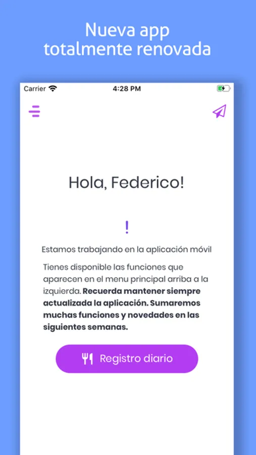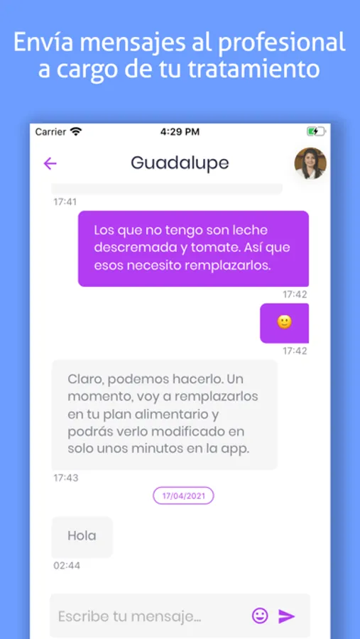 Podrás estar en contacto directo con el profesional, ver tu evolución, tu plan alimentario y modificar los datos de tu perfil. También, podrás llevar un registro diario y así obtener mejores resultados del tratamiento.