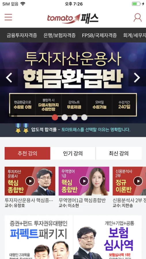 금융자격증 교육 전문기관인 토마토패스는 업계 최고수준의 압도적인 합격률, 최저가격, 최장 수강기간(180일), 무제한 반복 수강으로 토마토패스가 추구하는 수험생들을 위한 강의로 그 가치를 증명합니다.