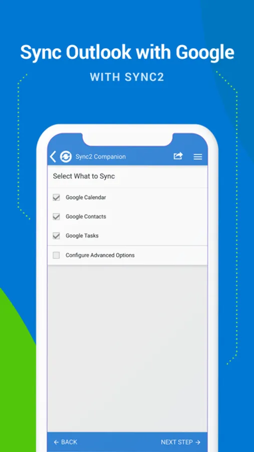 Sync Microsoft Outlook with your iPhone/iPad using Google account. Use Sync2 to set up synchronization of your Google account and Microsoft Outlook. Set up the Google account on your iPhone or iPad and have your data synchronized both ways.