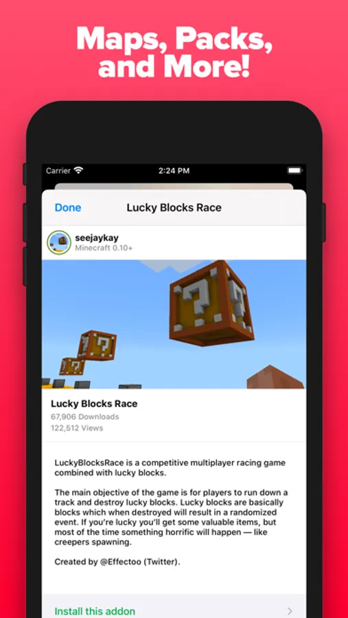 From the makers of Skin Creator for Minecraft comes the ultimate Minecraft add-ons app. This app comes packed full of add-ons for Minecraft PE (Bedrock Edition)!