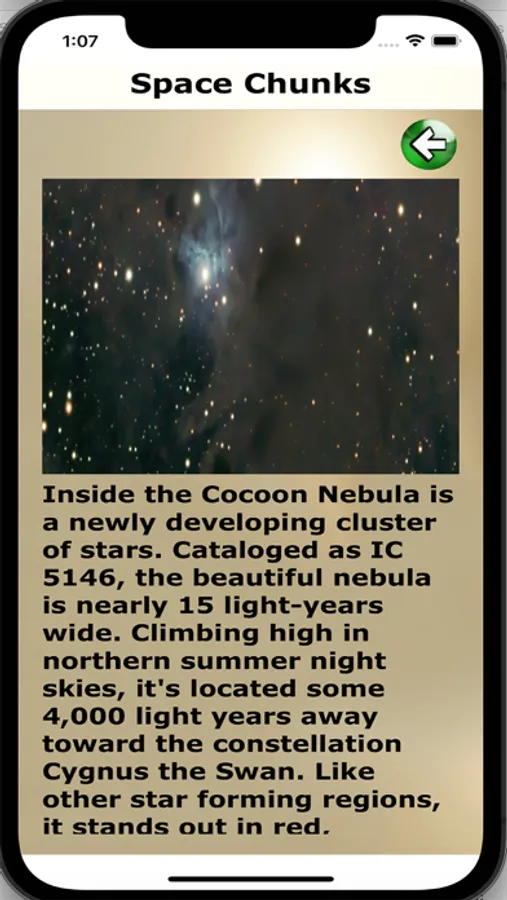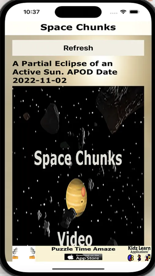 "Space Chunks" shows images/videos and a short explanation as described by NASA's APOD. It has a set of 12-15 images or videos with description for the current month and year. The app also shows the image/ video of the day. Please hit the refresh button to check the current image/ video. At the end of every month or 2, the existing images / videos is replaced by a new set of videos and images, that are retrieved from NASA's APOD. A notification is shown when new images are available if the user allows notifications to be displayed for this app.