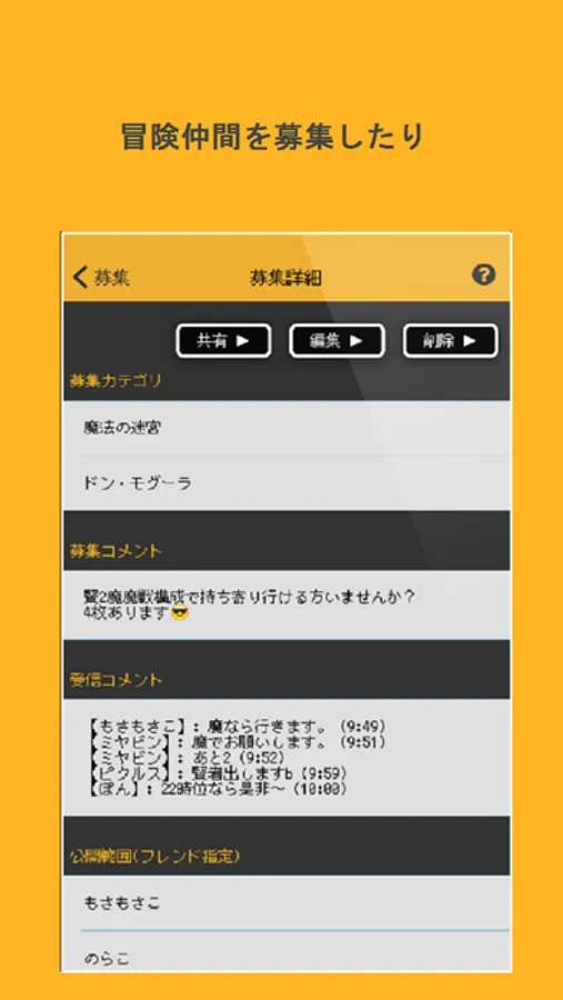 仲間募集 (緑玉) と同じ要領で募集を作ることができます。