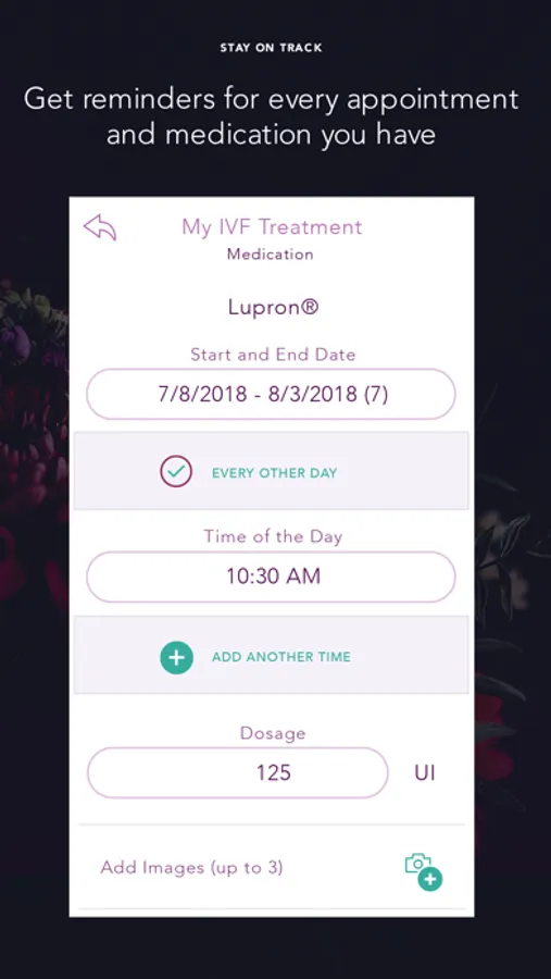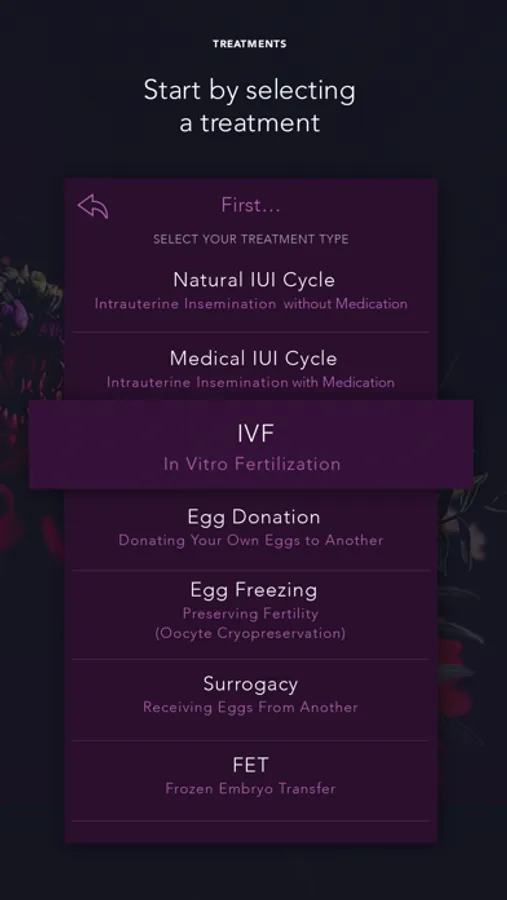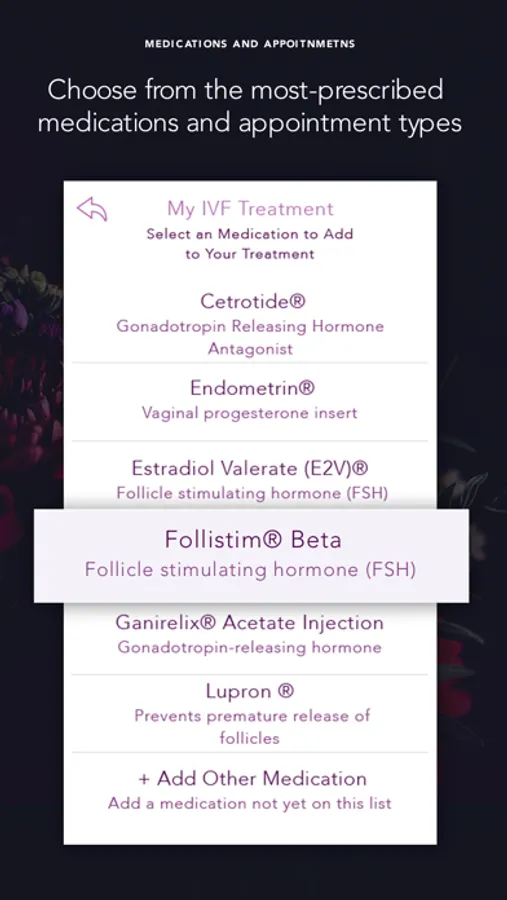 Easily input your treatment -- IVF, Mini IVF, IUI, FET, Egg Freezing, Surrogacy or Egg Donation -- and choose from the most-prescribed medications and appointment types, with the ability to add your own.
