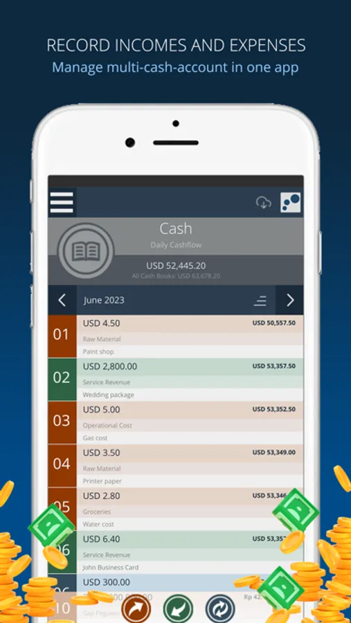 Got employees? Work in teamwork? Extra users (child-user) can be created to participate in cashbook activities. Supported by 4 types of unique access rights, you can ask other people to record without knowing how much balance you own.