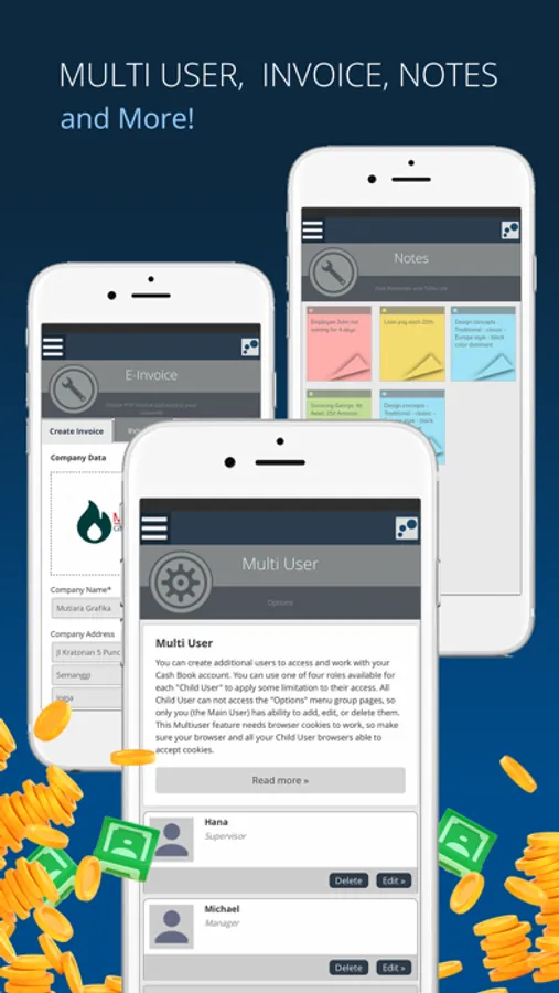 Able to create multiple cashbooks in one account. Transfer money from one cashbook to other cashbook. Record and set income and expense in several “money boxes” at once.