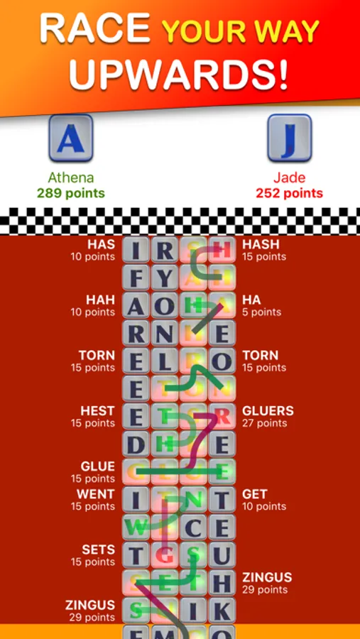 Zingus takes word swipe games like Boggle to the next level with a race to the finish line. Instead of a fixed set of letters to find words in, the letters go on and on like a race track, and you race through them as fast as you can.