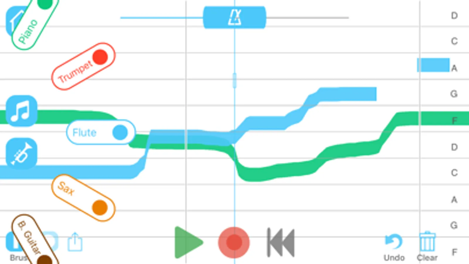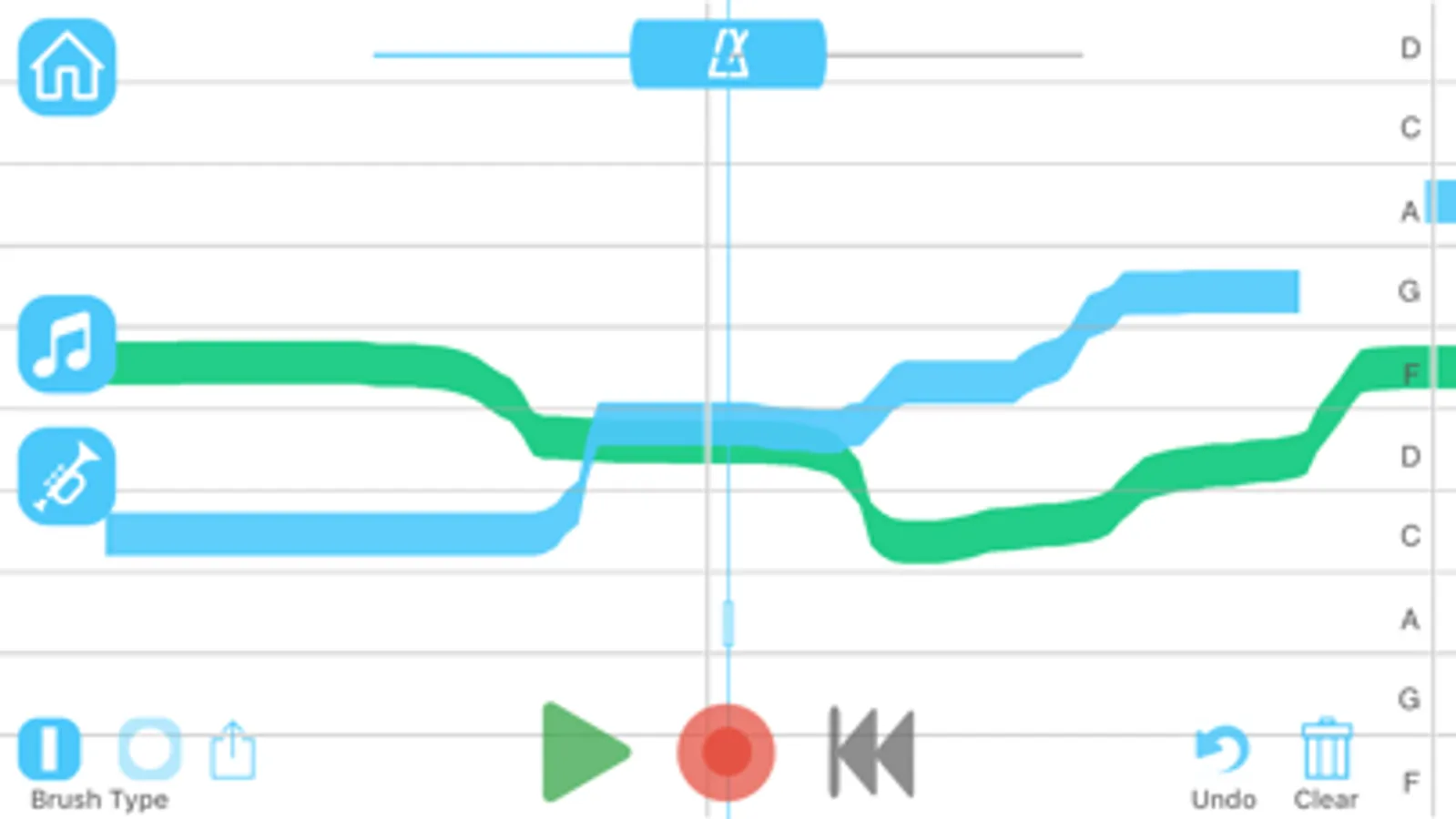 Tap the record button to get the canvas moving. As it scrolls by, a touch of the finger will play notes on the selected instrument. Moving your finger up and down will go up and down the scale. Tap the rewind button to go back to the beginning of the song and start again, this time adding beautiful harmonies. Once you are satisfied with your song, you can tap the home or clear button to save it. The load page will let you select any of your saved songs to listen to, or keep making changes if you want.