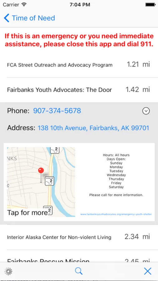 Sometimes the hardest task when in need is searching for help. With this easy-to-navigate app, users can locate the nearest shelter, food bank, soup kitchen, clothing closet, amongst many other services. Users can input their current address, use GPS functionality, or input (city, state) format when searching for services; services will be listed in geographic proximity from the set address. Currently, this app only serves the state of Alaska, and is not all inclusive.