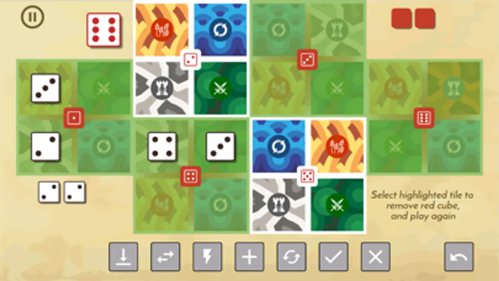 Land 6 is a solitaire board game where dice are not just rolled. You use dice to represent your armies in different regions around Land 6. Each of 4 regions allows you to perform special action by decreasing value of your die. These actions are for example deploy a new army, move an army, and attack the Lord of the Cubes. Your goal is to place one of your armies with a value of at least 3 in the home region of the Lord of the Cubes.