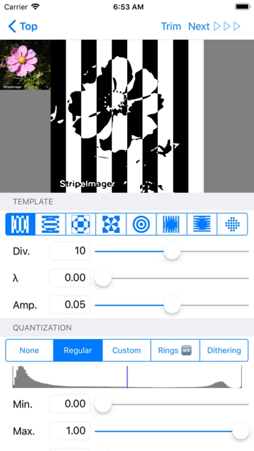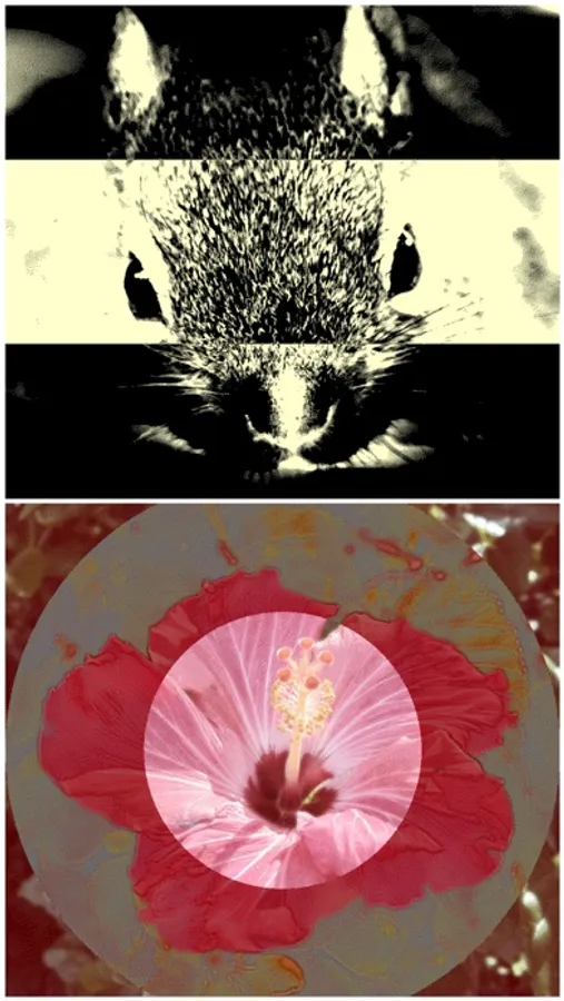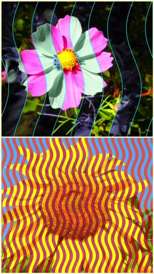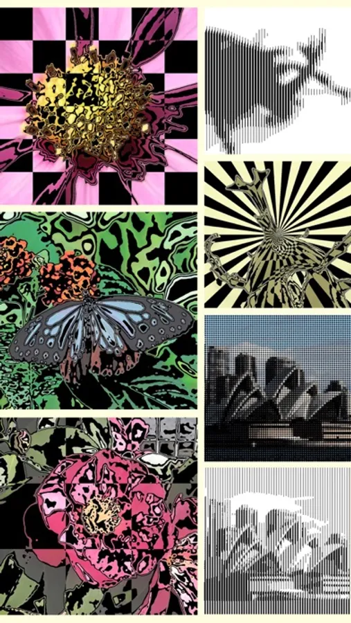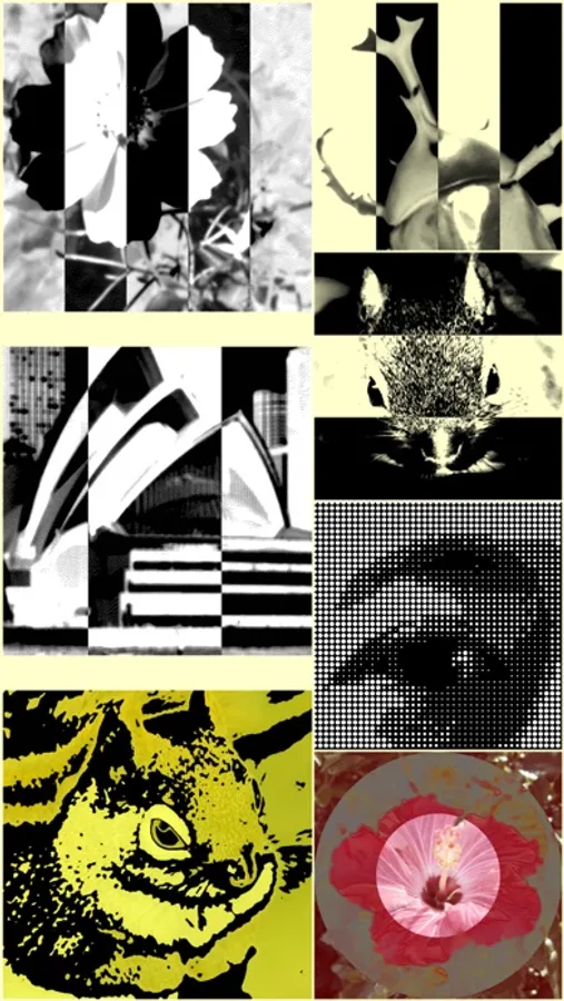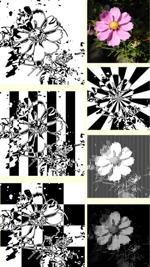 At first, a photo or video is converted to a two-tone image corresponding with its tone. Then the image is mixed with a template like stripe, check, radiation, fax, or dots.