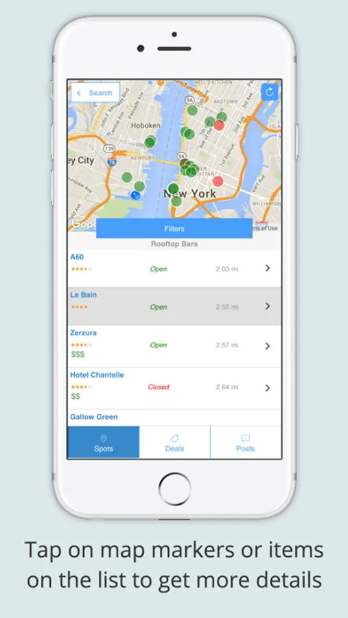 1. Quickly find Spots around you by tapping on quick buttons or anywhere in the world using the autocomplete search functionality.