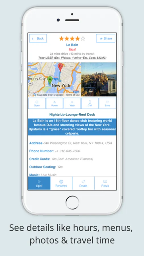 3. Quickly find important information and take action on route, uber availability and cost estimate, menu, reservations etc right from the Spot screen.