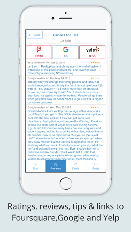 4. Look at ratings & highlights of reviews and tips from Foursquare, Google and Yelp all in one screen. Tap on the ratings icons to go to the respective review pages to get more details. Not all spots have reviews everywhere but between the 3 of them, there is a very good chance you will find something.