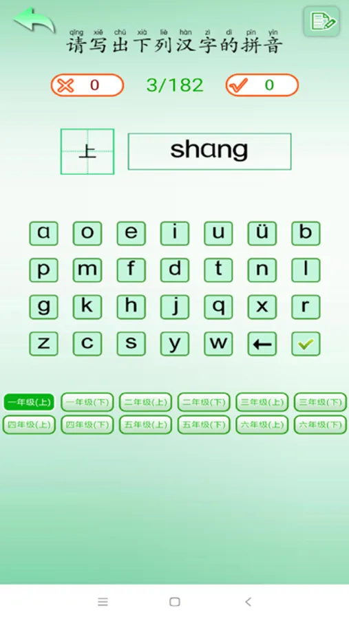 2, recognize the characters, fill in pinyin, give a question every round, click on the corresponding pinyin letters according to the book order, test the practical application ability of pinyin, and the characters cover all the new characters in grades 1-6 of primary school.