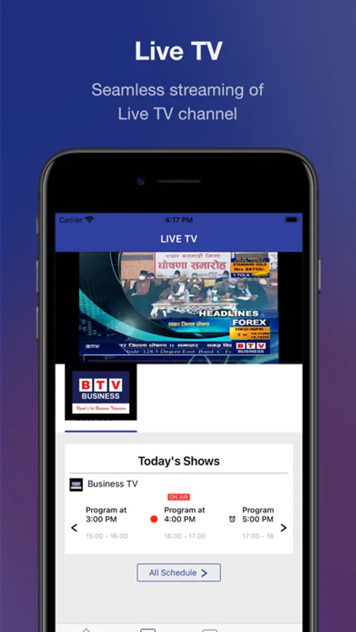Business TV is the Nepal's first Business television channel and Business TV Nepal iOS App brings everything Business TV offers right at the users' iOS device. Viewers of Business TV channel should not always be waiting to watch the news, interviews in their television set as Business TV Nepal iOS App helps you in getting stay updated from this Live app with the help of internet connected anywhere in the globe.