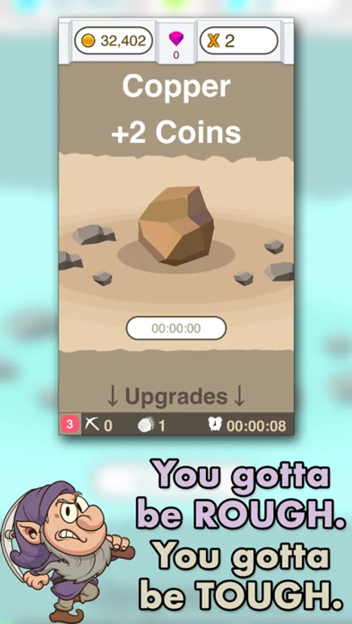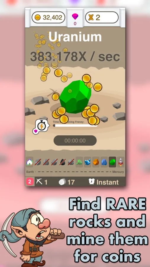 Claim your Mini Mine today! Start with a tiny dwarf pick axe and start tapping (mining)! As you mine rocks you will make money, spend that money on unlocking more rare rocks, elements, ores, and mini mines! Once you earn enough you will be able to afford a rocket ship off your planet and onto a rarer one with galactic new elements, rocks, and ores worth even more coins! Grow your mini mine empire today and explore new worlds and ores!