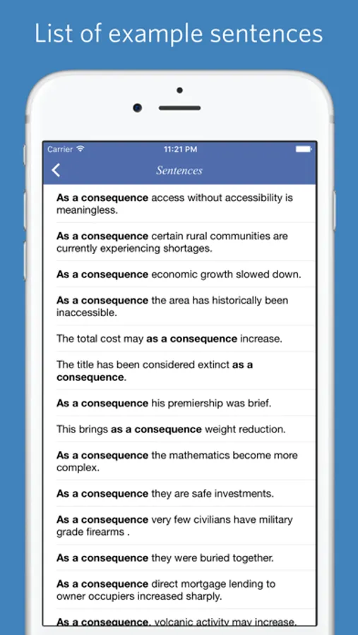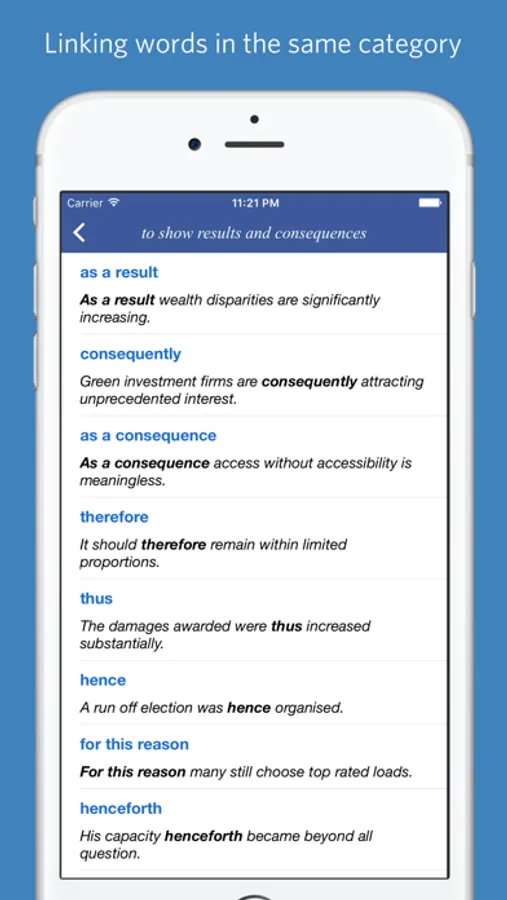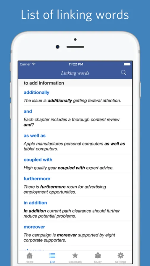 - Each linking words comes with a number of example sentences. Over 10000 sentences are added. This will help you to have better understanding of how a linking word is used in context.