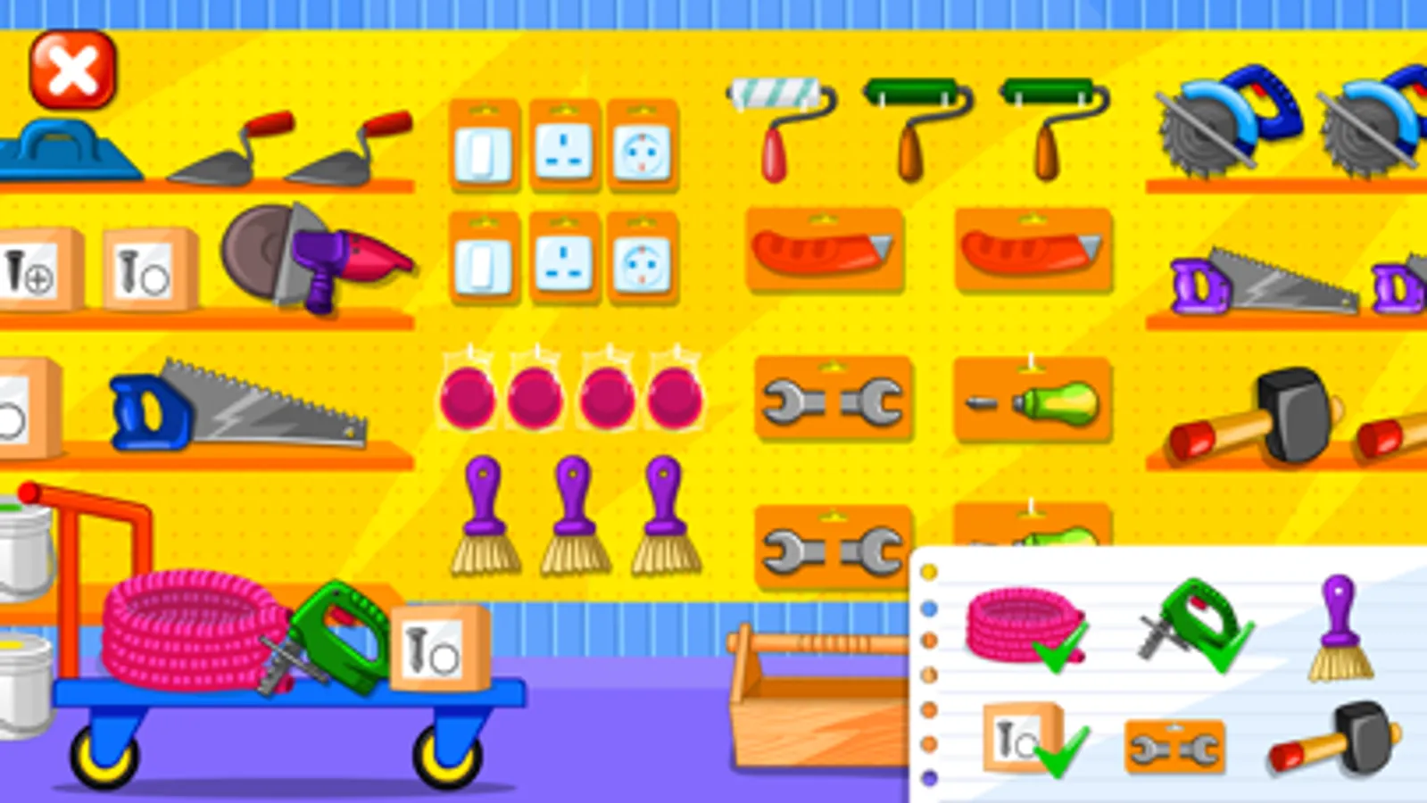 • Build the house: Pick builders tools and avoid toys and candies in the fun Catcher mini-game. Then build a house by adding windows, walls, a door, a balcony, stairs and a roof to make it a dream house.