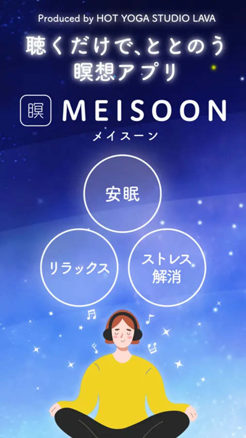 また、MEISOONは日本最大級の店舗数をもつホットヨガスタジオLAVAが監修し、瞑想のプロによるガイドと瞑想用に作曲されたオリジナルの音楽に、瞑想のスペシャリスト達の優しい声のナビゲーションをのせ、聴くだけで誰もが簡単に瞑想できる環境を実現しました。
