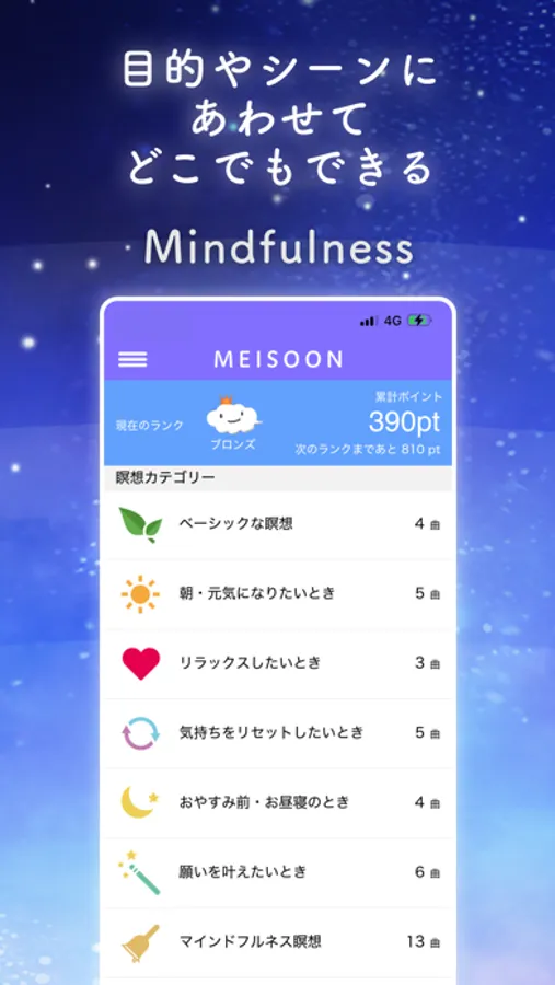 瞑想アプリMEISOON(メイスーン)は、瞑想がはじめての方から瞑想の上級者の方にも楽しんでいただけるよう、目的別・シーン別から選べる瞑想と、マインドフルネス、ヨガやBGMなど豊富な瞑想メニューを用意しています。