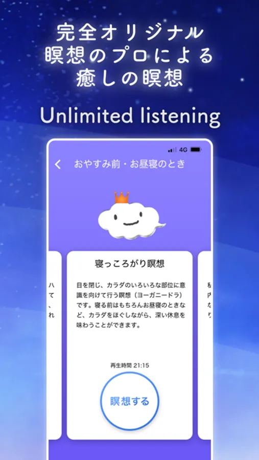 呼吸の誘導に耳を傾けるだけで簡単にできる「はじめての瞑想」や、1分からできるマインドフルネス、寝ながらできる「寝っころがり瞑想(ヨガニードラ)」など、日常生活の中に溶け込む瞑想楽曲が複数用意されています。 瞑想するための準備は必要なし。